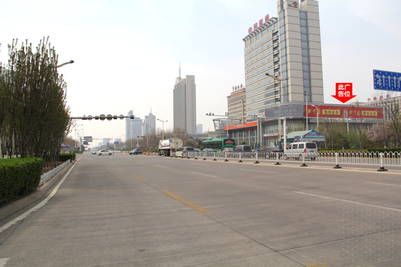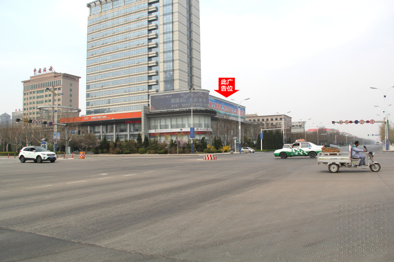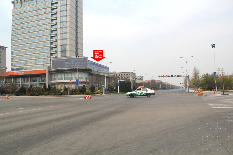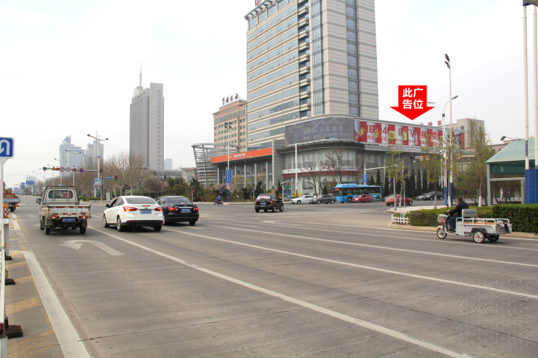 黄河五路与渤海十六路交汇处西北角楼顶大牌